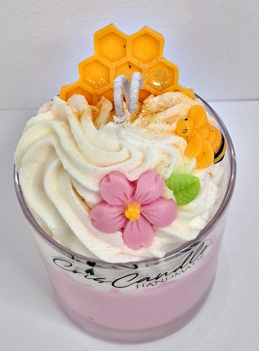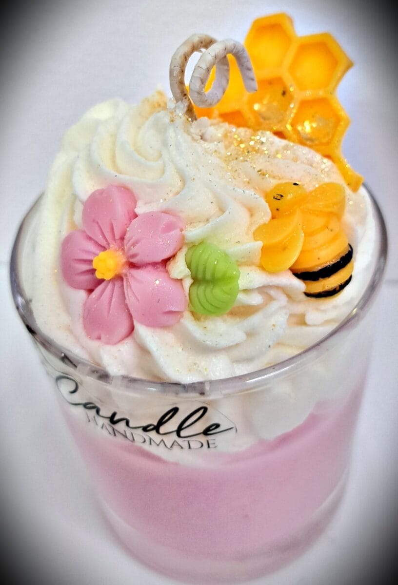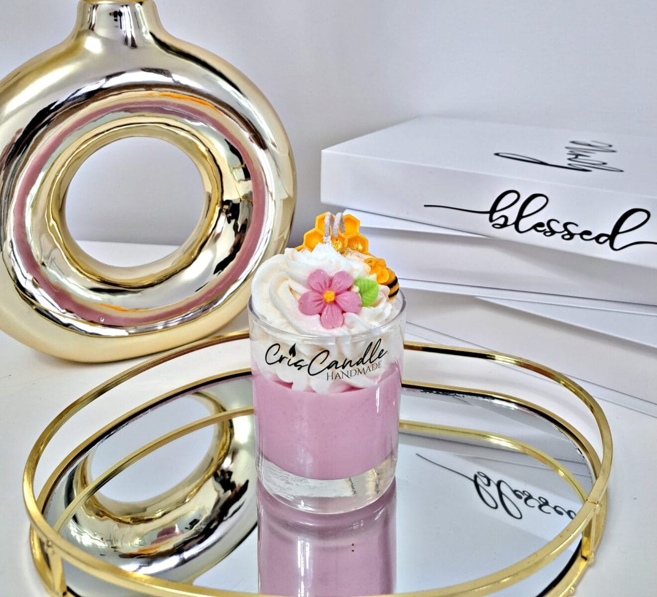 Această lumânare este un obiect decorativ artizanal, realizat manual, cu un design inspirat de produse alimentare (ex: prăjituri, înghețată, milkshake etc.).